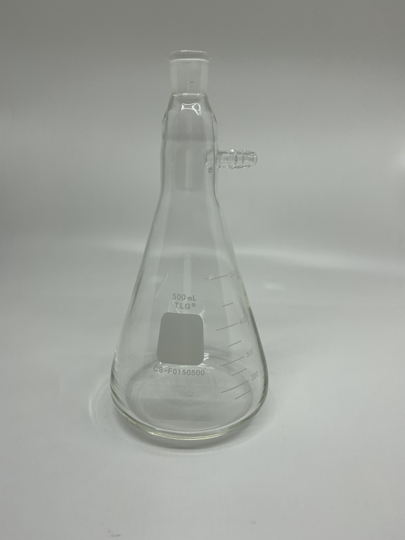 Heavy wall Erlenmeyer-shaped filtering flask with standard taper outer joint and serrated hose connection for attachment to vacuum source.